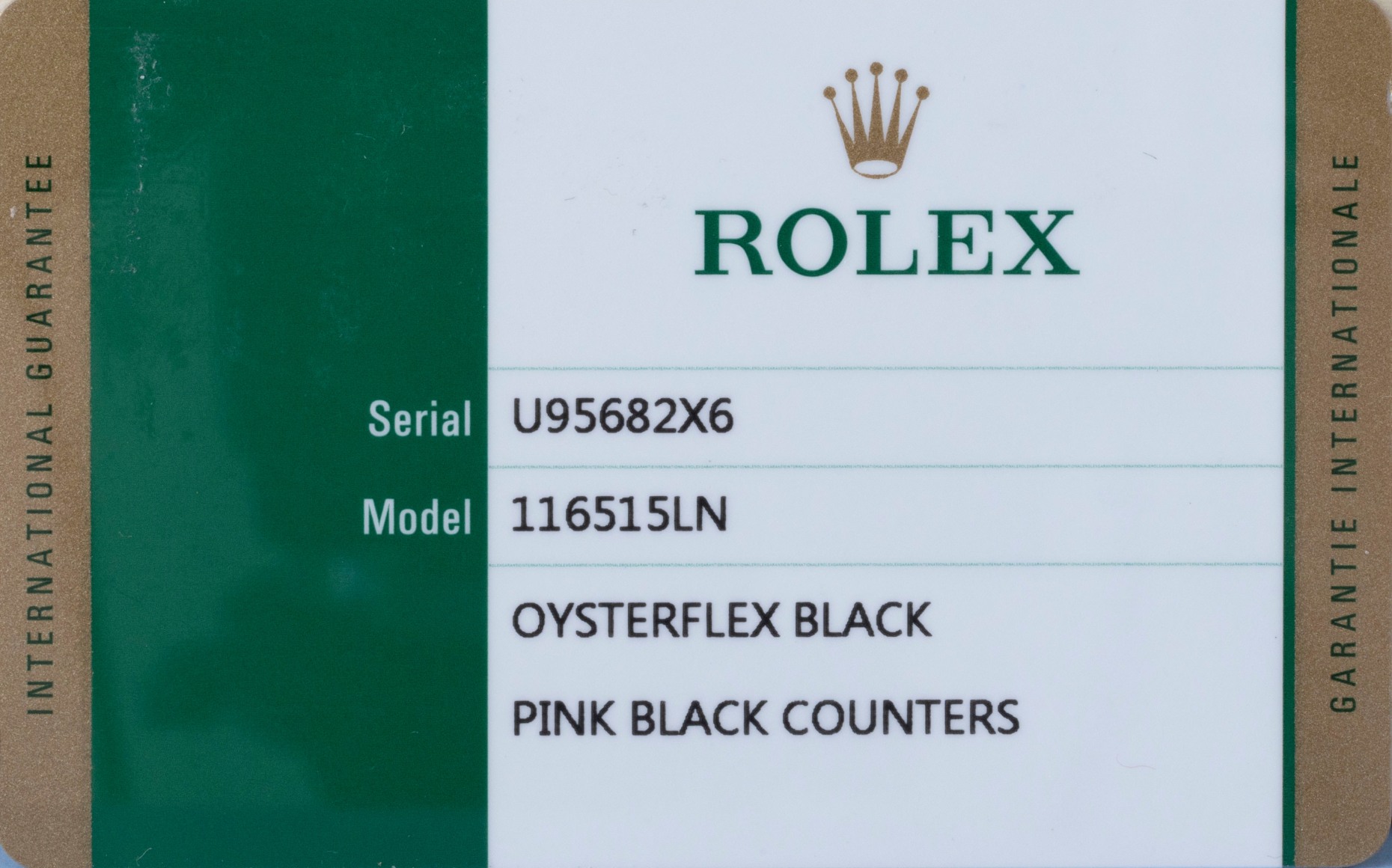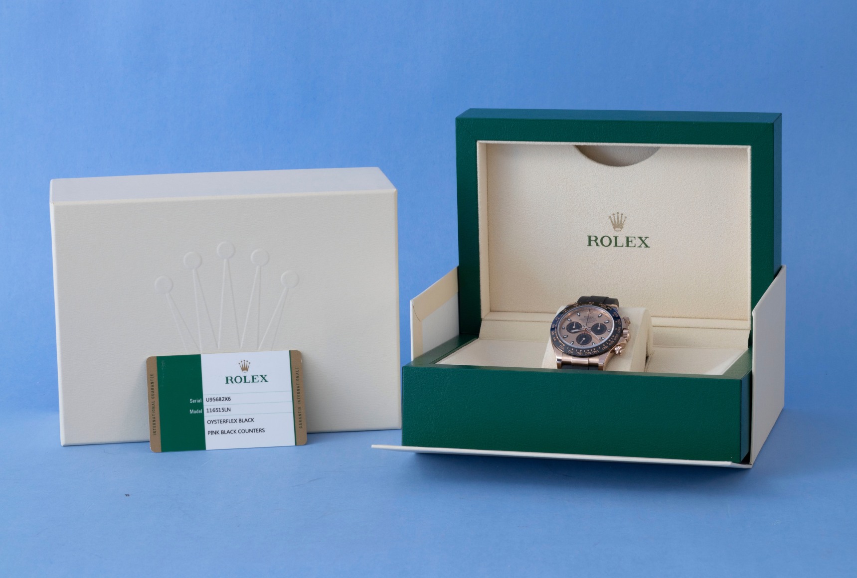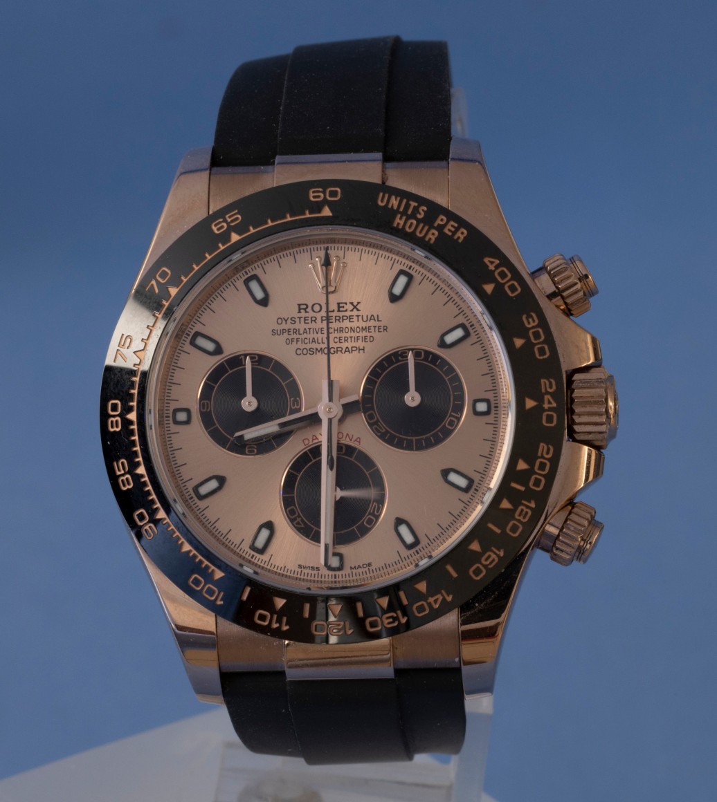Roles Datona Everose Case with Sundust dial serial number U95682x6 on inside bezel and Rolex Card. The watch was wasa manufactured in . Watch has Rolex Oysterflex Strap with rosegold depoyand buckle.