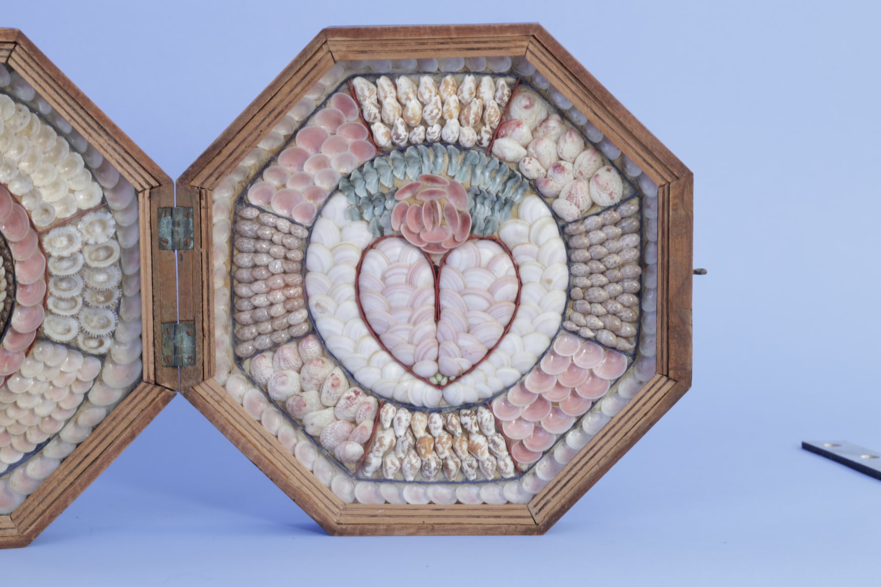 Condition: The valentine is a fine example with an attractive shell pattern which is complete on booth sides with no missing shells. The case is a fine condition and has a typical warp but it does close when hooked.
