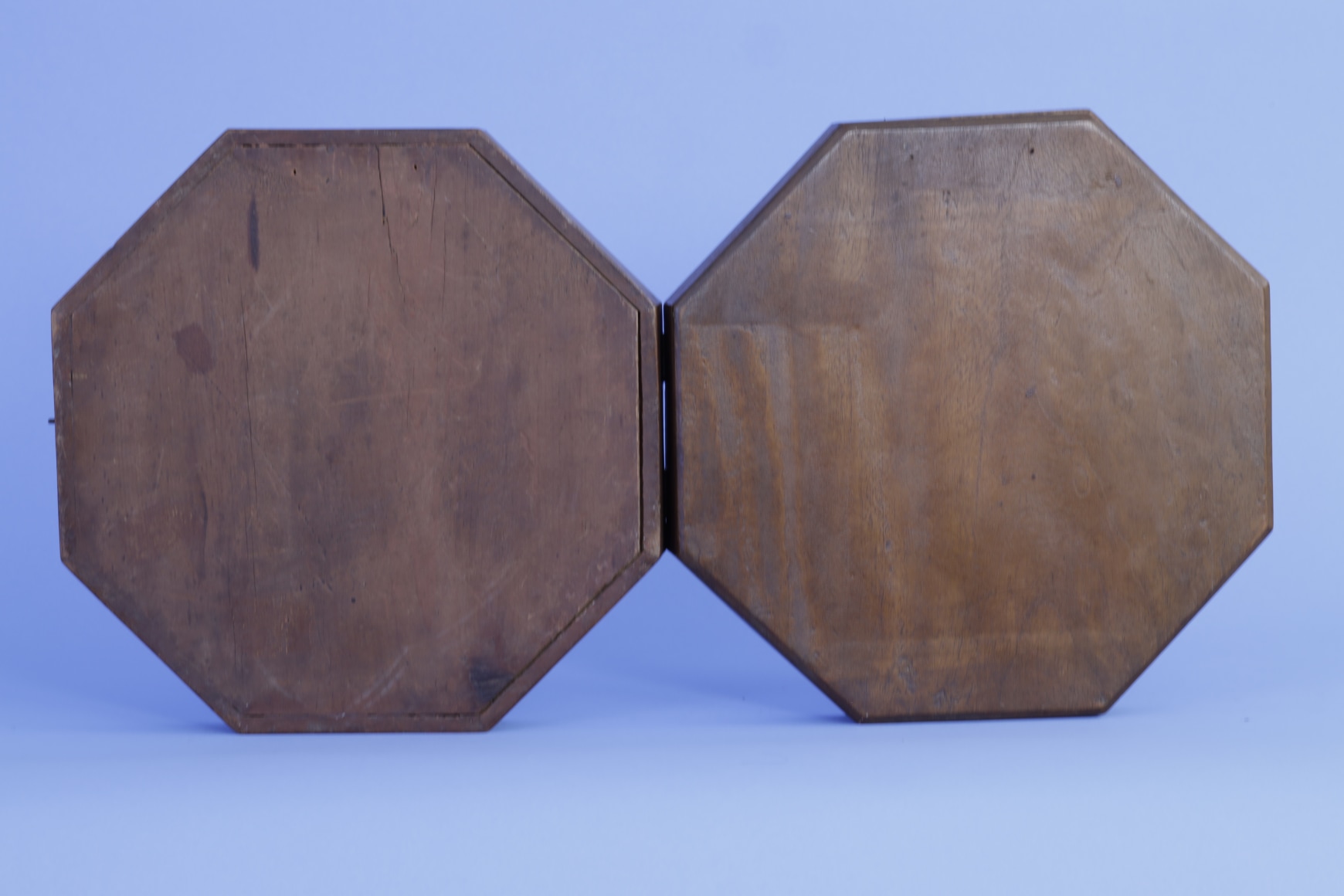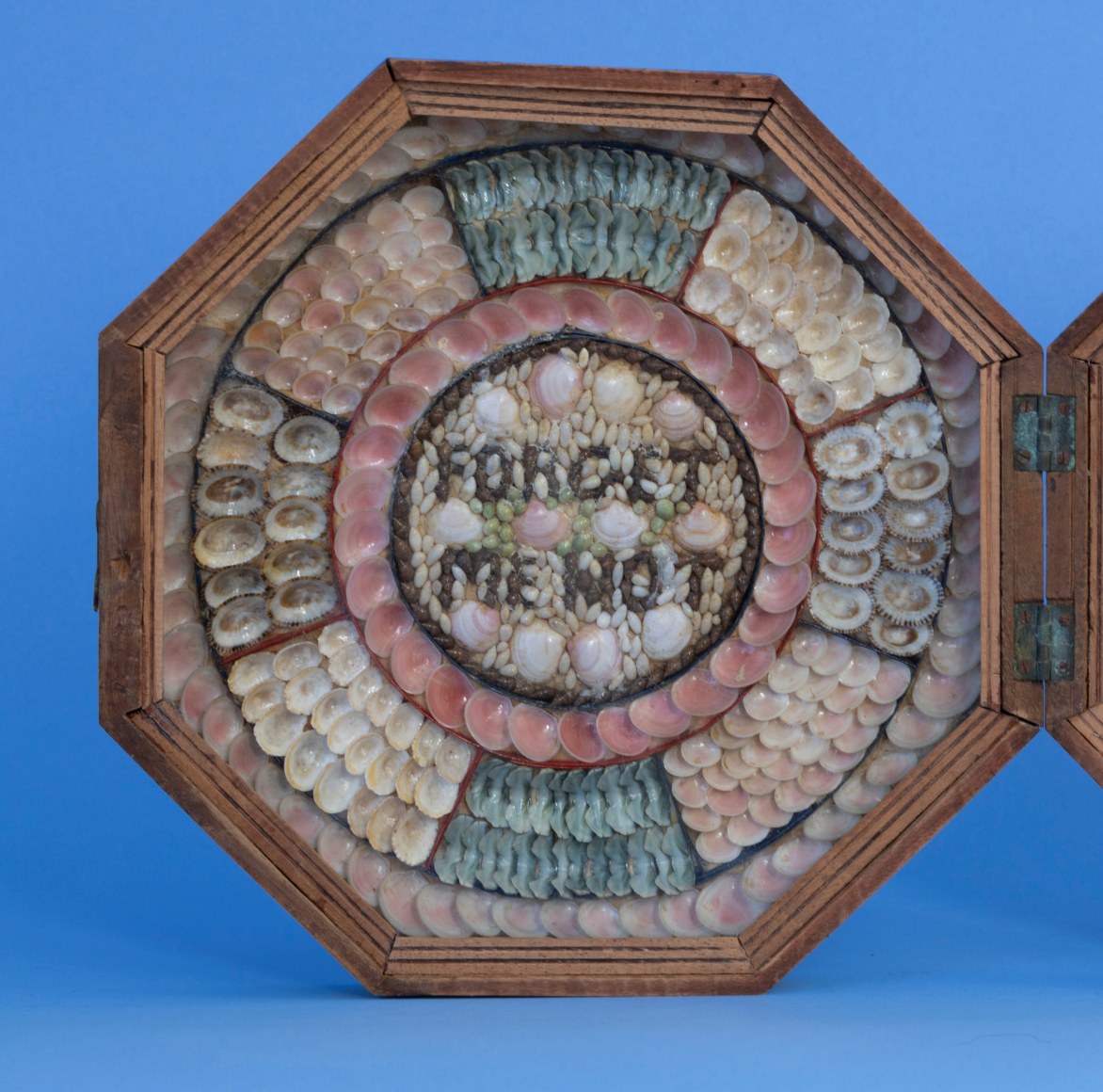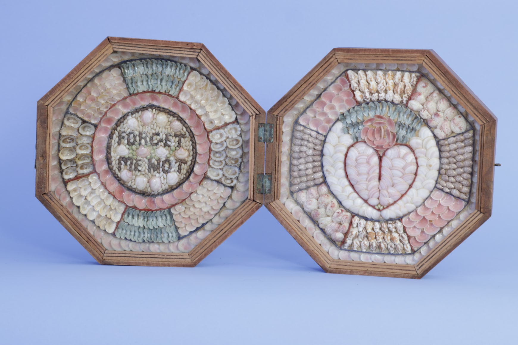 Sailors Valentine with inscription "Forget me Not" Barbados last quarter 19th Century. The top and sides of the case are mahogany and the back wood is a typical pine like wood found on most valentines. The case has its original oxidized brass hinges and closure hook that works. The left side shell image has the expression “FORGET ME NOT” IN DARK SHELLS” WITHIN A ROUND BORDER “. There three layers of shells in a circular pattern going out to the blue border paper. The right-hand image Has a hart made of pink shells below a ping rose raised pattern withing a wide circle with white shells. There are two other shell patters moving towards the border with pink paper. It is rare to have two different color paper backgrounds on a particular valentine. The valentine retains its original wavy glass and the perimeter molding are complete as well. (FA1132)