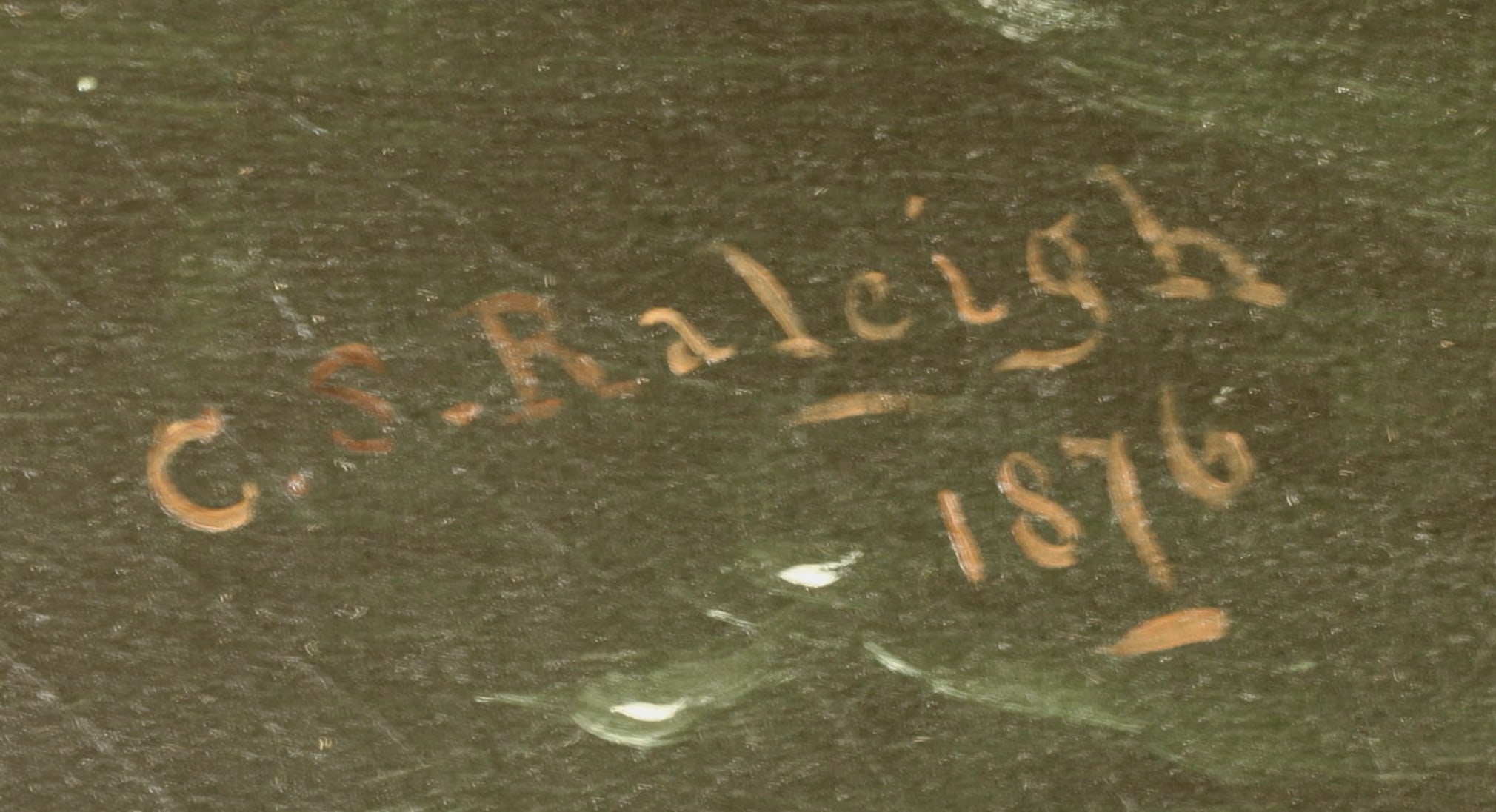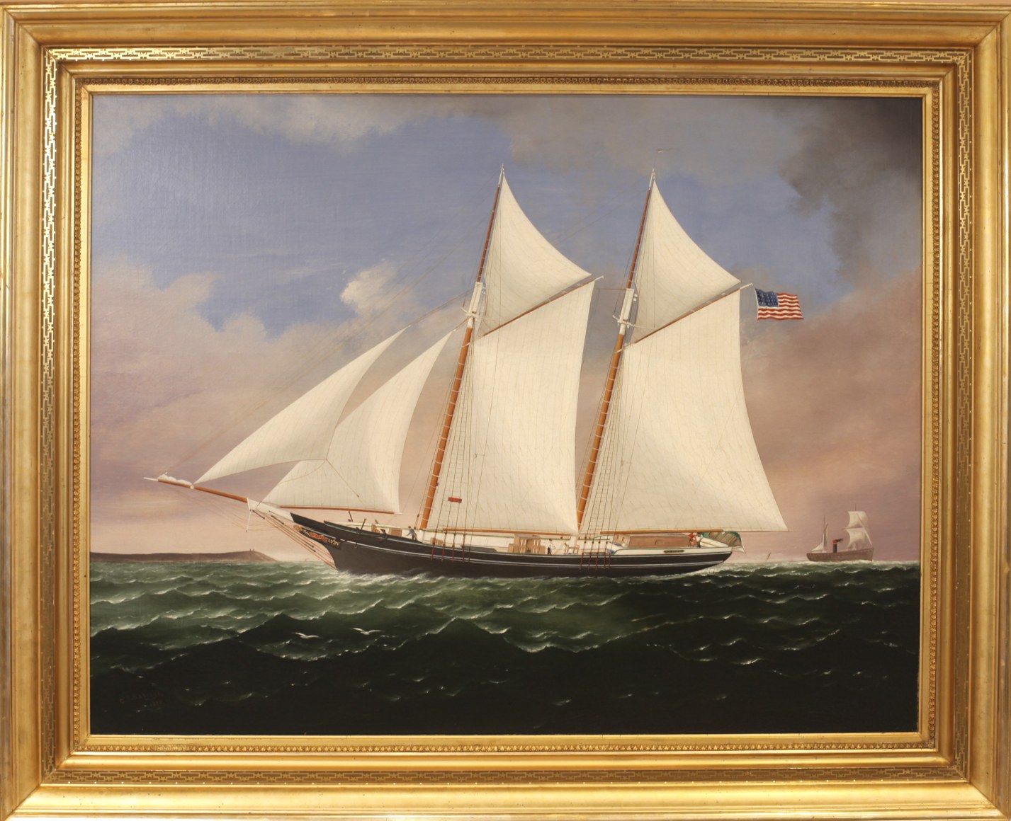 (American 1830 - 1925) Oil on canvas, of the two masted schooner M.H. Read, signed lower left and dated 1876. This is one of Raleigh's large and finest works. The color is extremely bright and rich. The painting depicts a port view of the schooner M.H. Read. The vessel has a well detailed billet head with trail board bearing the vessels name. M.H. Read appears on a quarterboard near the stern. The vessel is under full sail and she is flying the American flag off the gaff. To the right on the horizon in the distance is a primitive rendering of a transitional steamsail vessel. The water is beautifully highlighted around the vessel and one can sense the wind swept water spraying against the bow. (PA-838)
