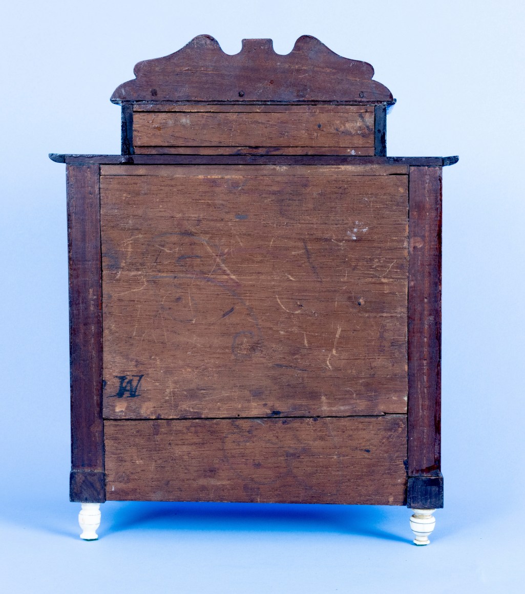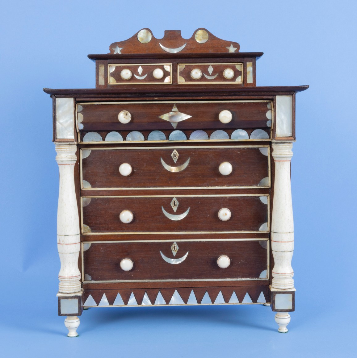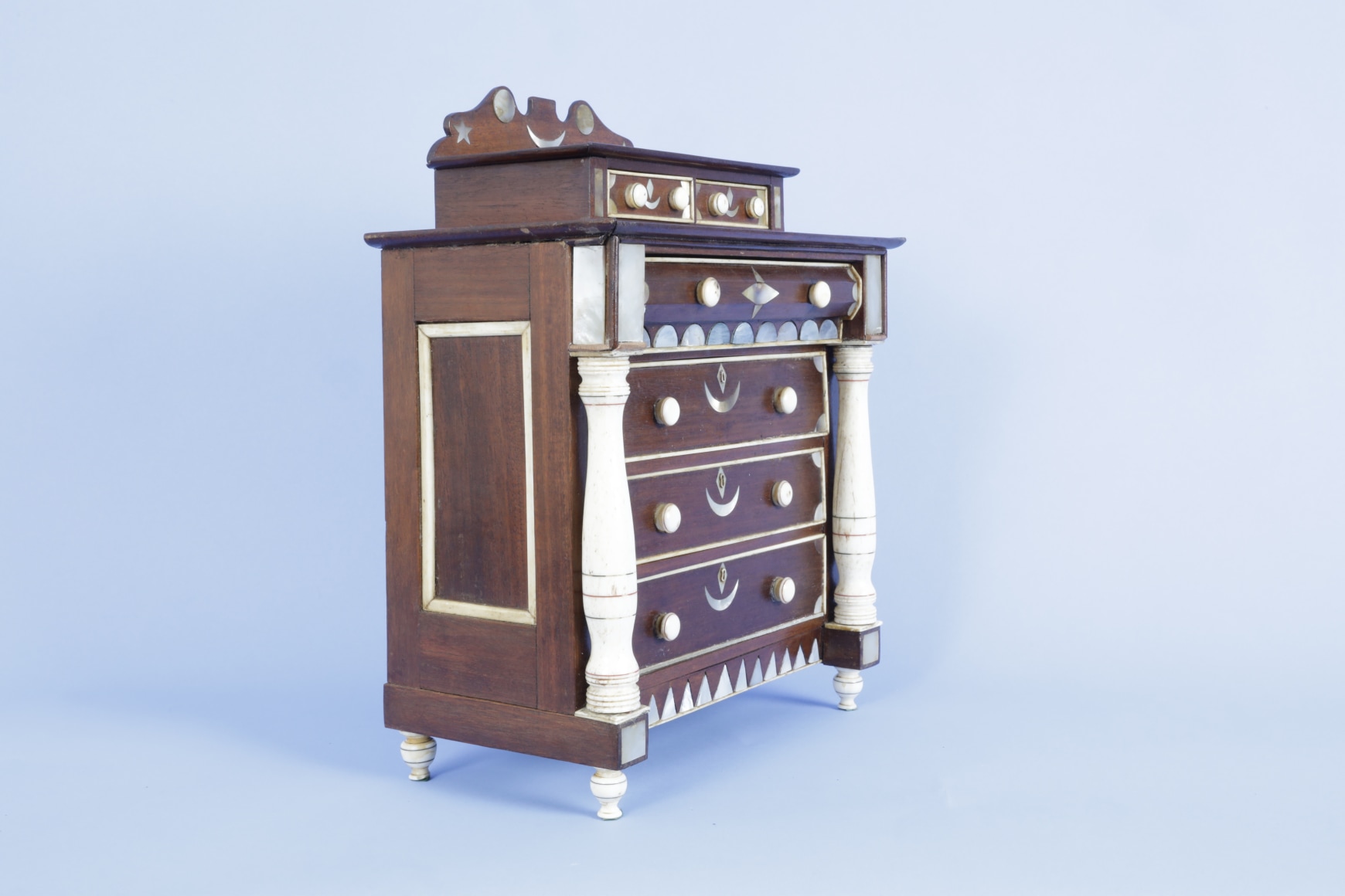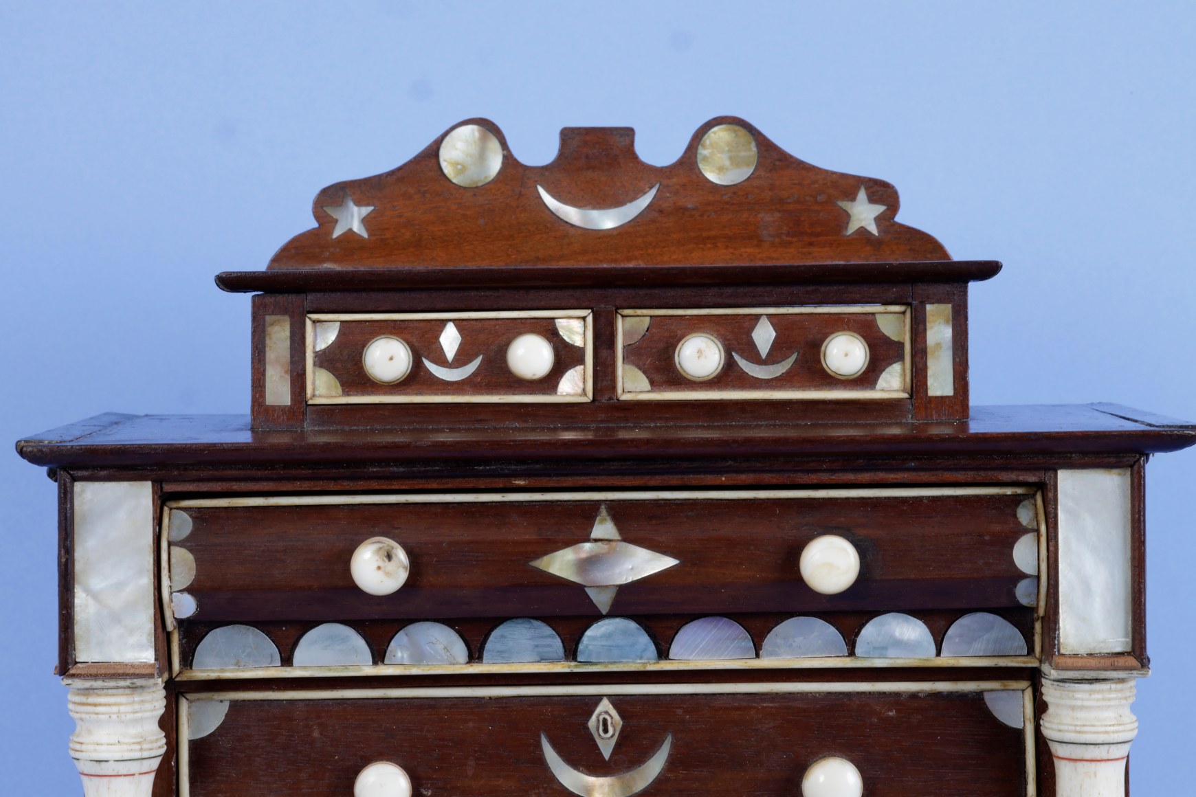 Scrimshaw mahogany miniature chest of drawers in the American Empire style, American, circa 1840. The chest has at the top a small added two drawer section with a broken arch pediment. This section has inlaid mother of pearl circles, quarter circles, diamonds and whale ivory drawer pulls. The main chest has a molded top above four graduated drawers with similar inlays at the top section. In the Empire style, the sides of the chest have split whalebone shaped columns with wax filled green and dark blue sealing wax scribe lines. The three lower drawers have diamond shaped inlays at the center with miniature false key holes set into the diamond mother of pearl inlay. Below the top drawer and at the bottom of the chest is a series of mother of pearl inlays which appear in a “saw tooth” pattern. Below