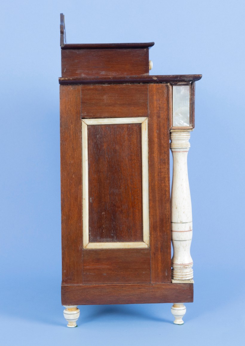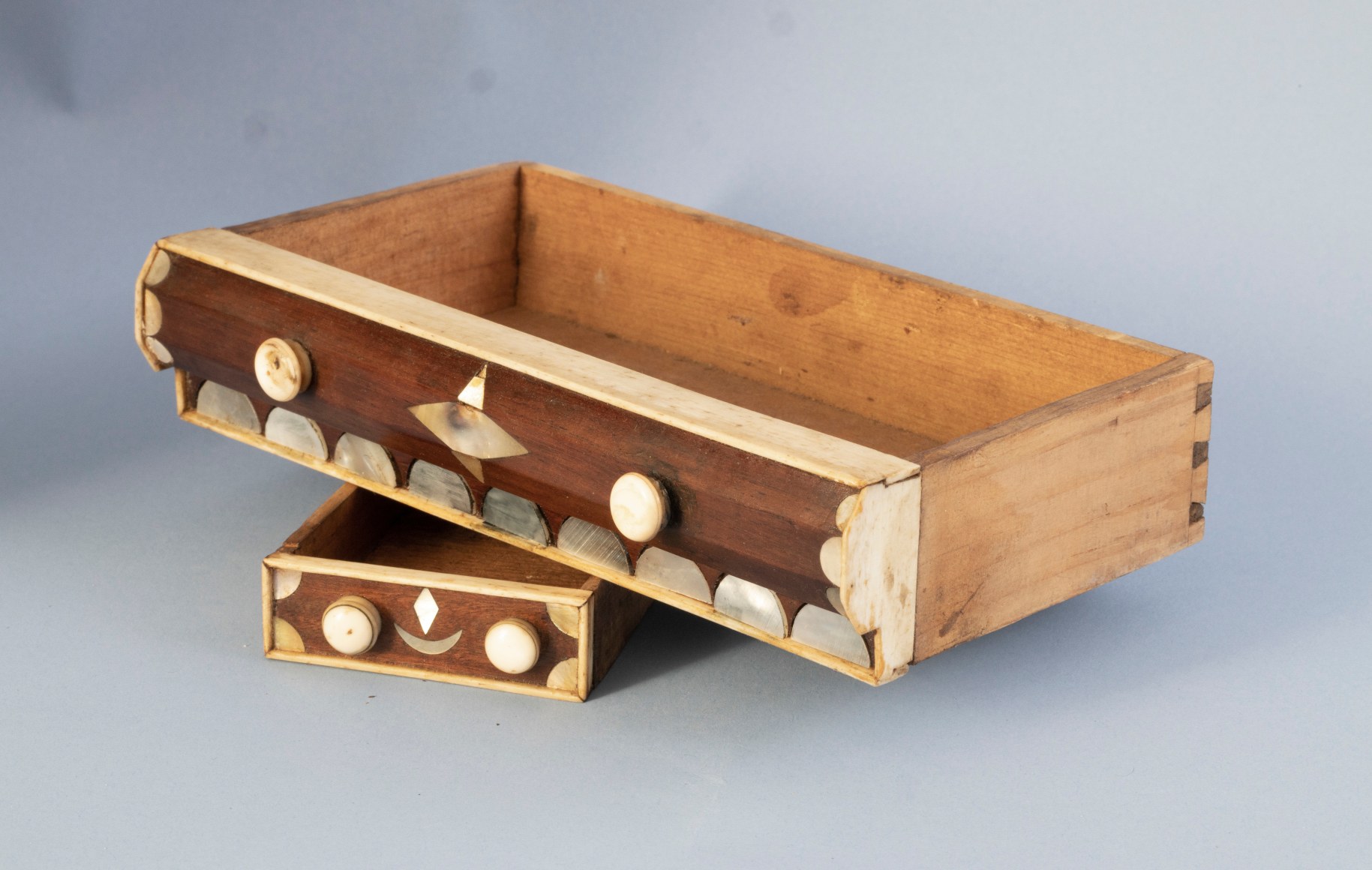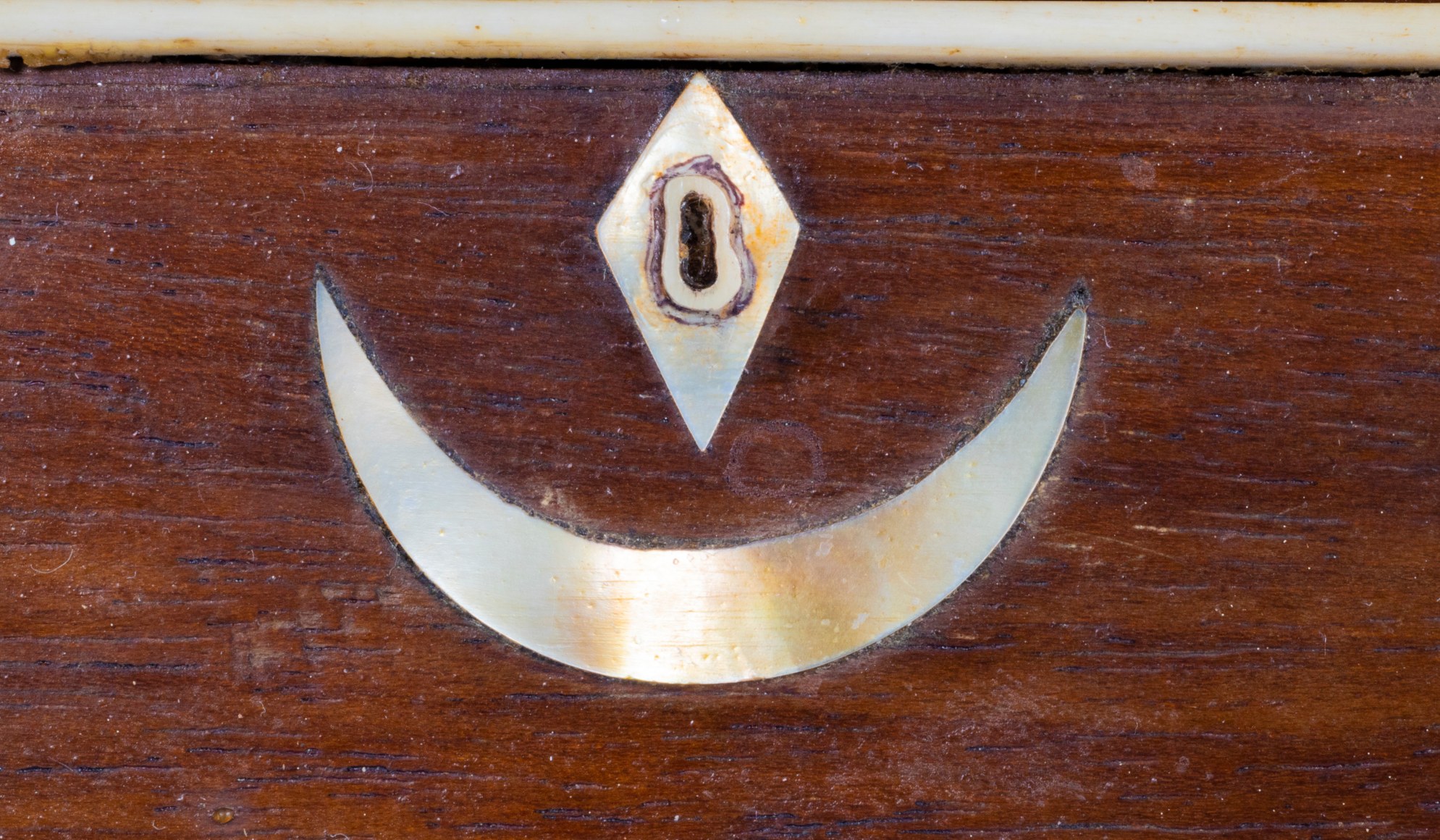 the columns are mahogany blocks that protrude from the box with square mother of pearl square inlay embellishments. The whale ivory feet have bulbous turnings with scribe lines also with sealing wax inlay. The sides of the box have recessed panels with the edges trimmed in whalebone. The drawers are dovetailed joined and all the out side edges are trimed with whale bone and the chest has unfinished mahogany panels with the initials in large black ink “JAI”.