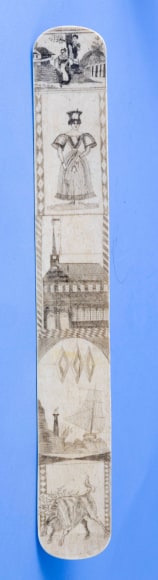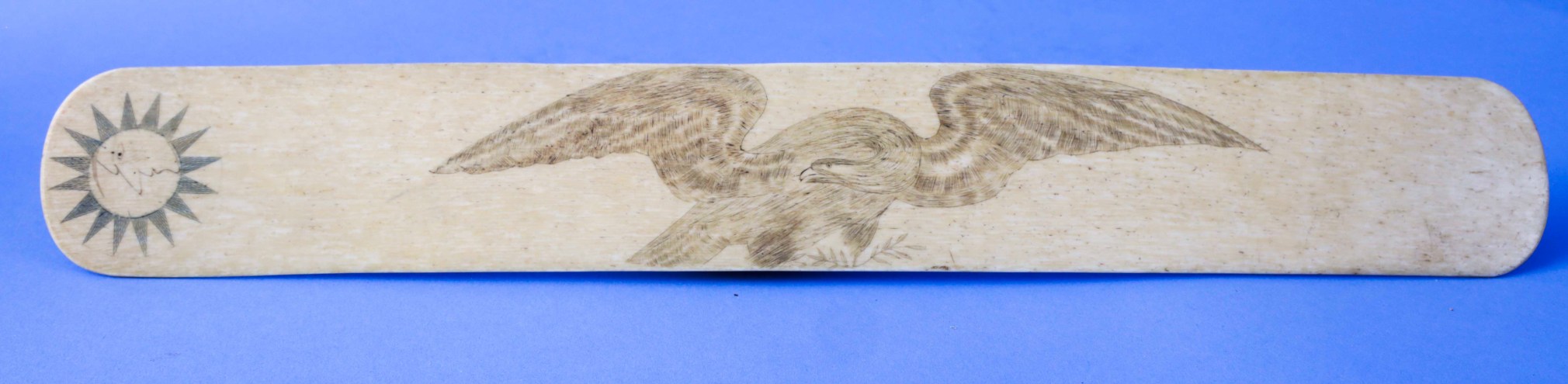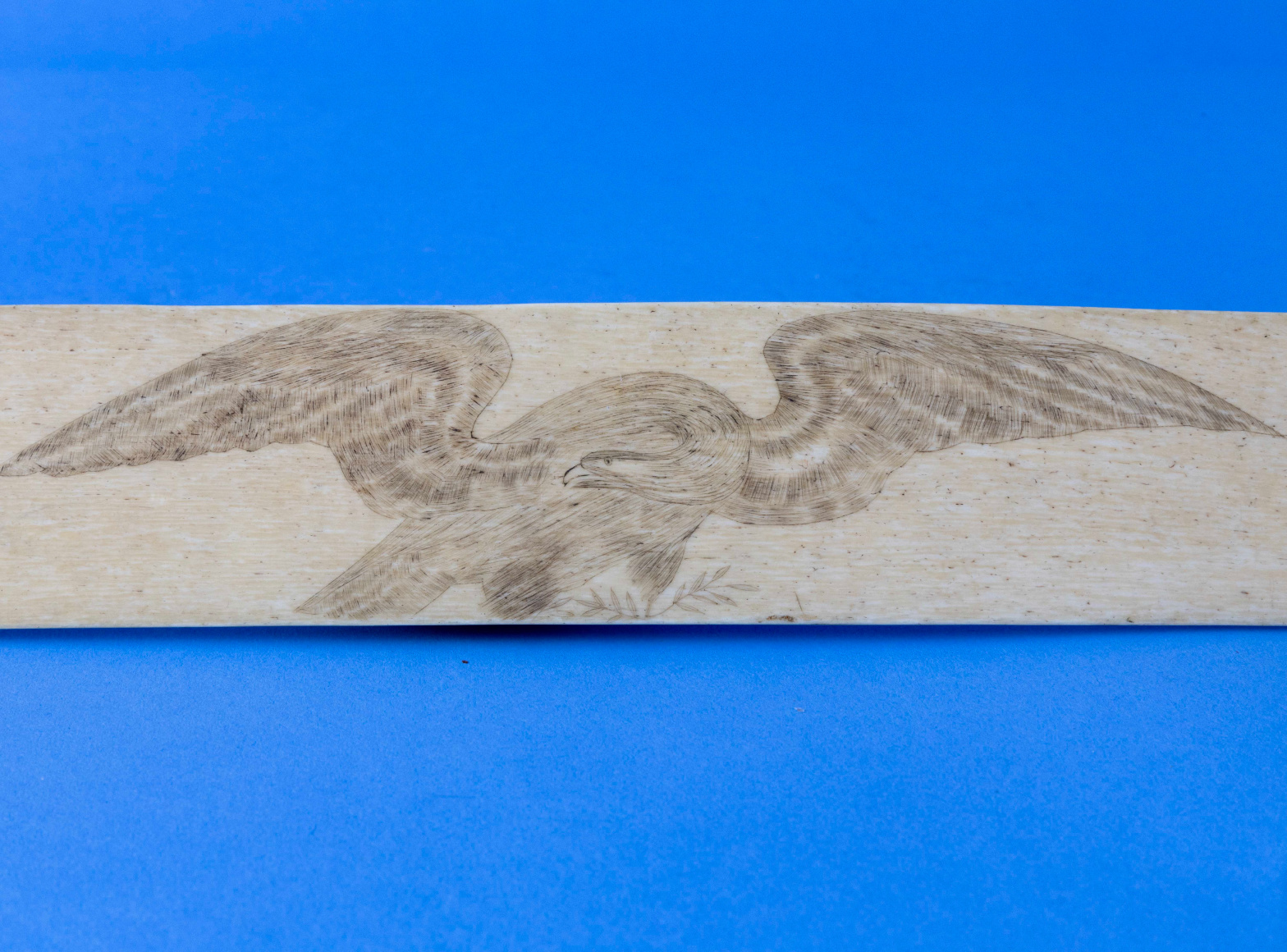 SCRIMSHAW WHALEBONE PANEL IN THE FORM OF A CORSET BUSK, American, circa mid-19th century.