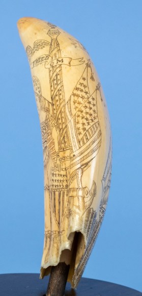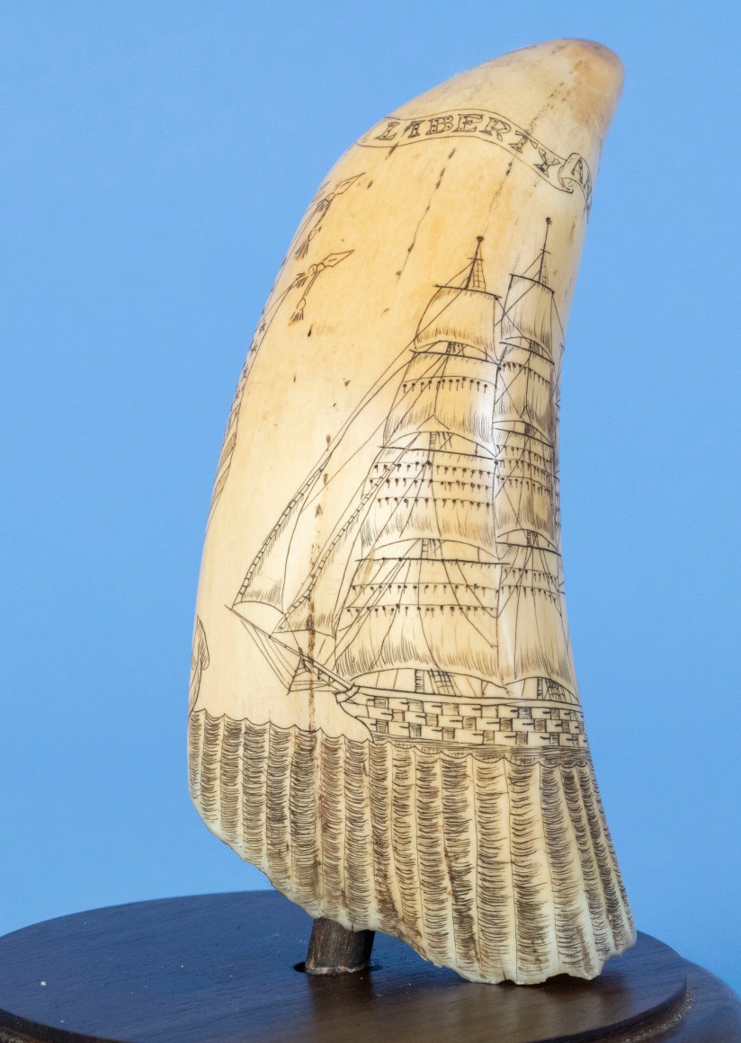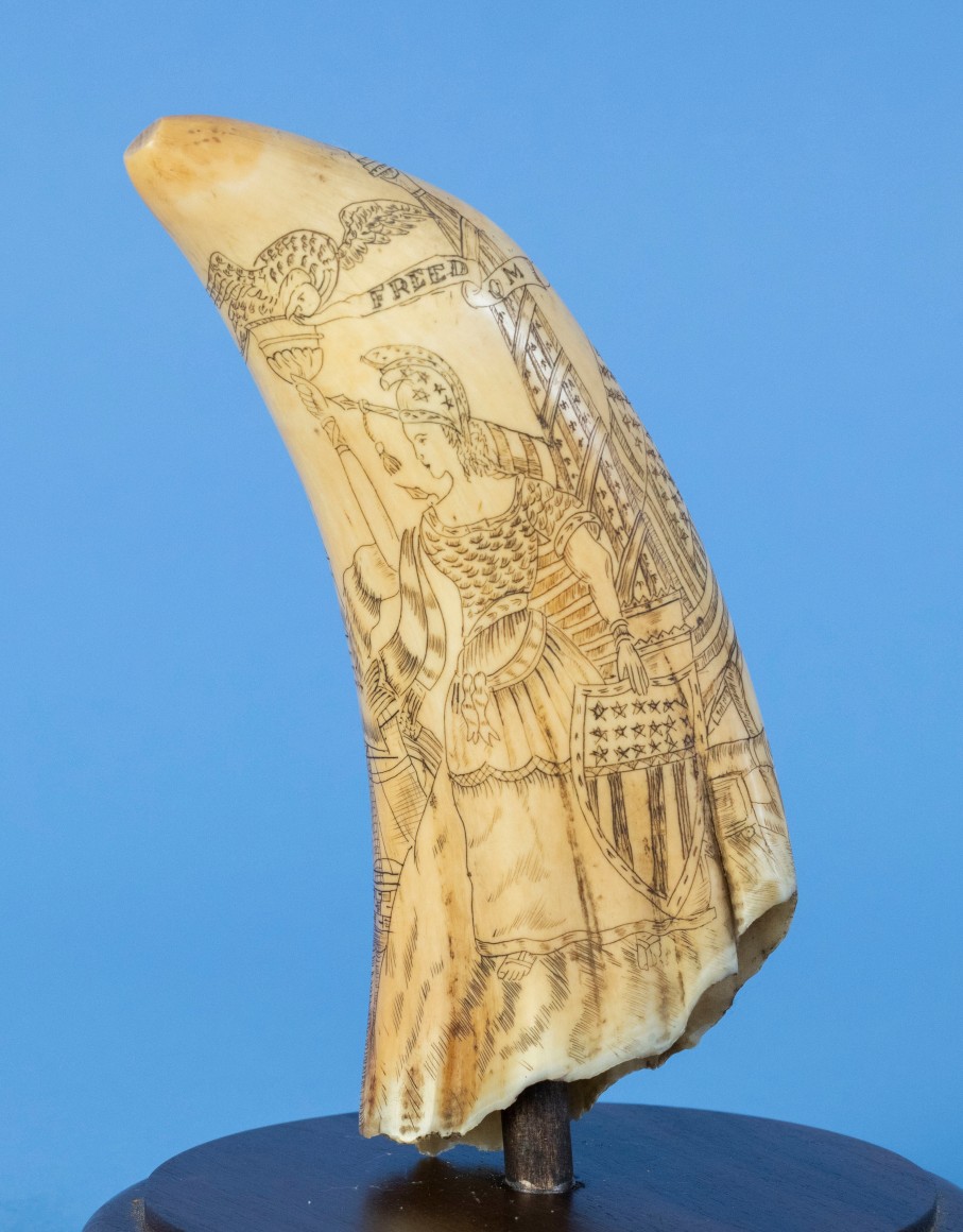 Scrimshaw whales tooth attributed to Samuel W. Tenney (1827-1912). The obverse depicts Liberty standing wearing a long fancy dress and a liberty cap with stars on her head. With her left hand she is holding an American shield which is resting on the ground. Her right hand is holding a chalice with an American eagle resting on the top. The eagle is holding a banner in his beak that states “LIBERTY AND FREEDOM”. This banner wraps around the tooth which is a common practice of Tenny to wrap his images around a tooth. To the right of Liberty are two American flags with a cannon and anchor below. The reverse of the tooth has an engraved triple decker Ship flying an American flag from the gaff. The detail of the ship is excellent showing all the sails with reef points and sail seams. The rigging is also very detailed and the water is engraved below the ship. All of the engraving on this tooth is very bold and strong. (SC1252)