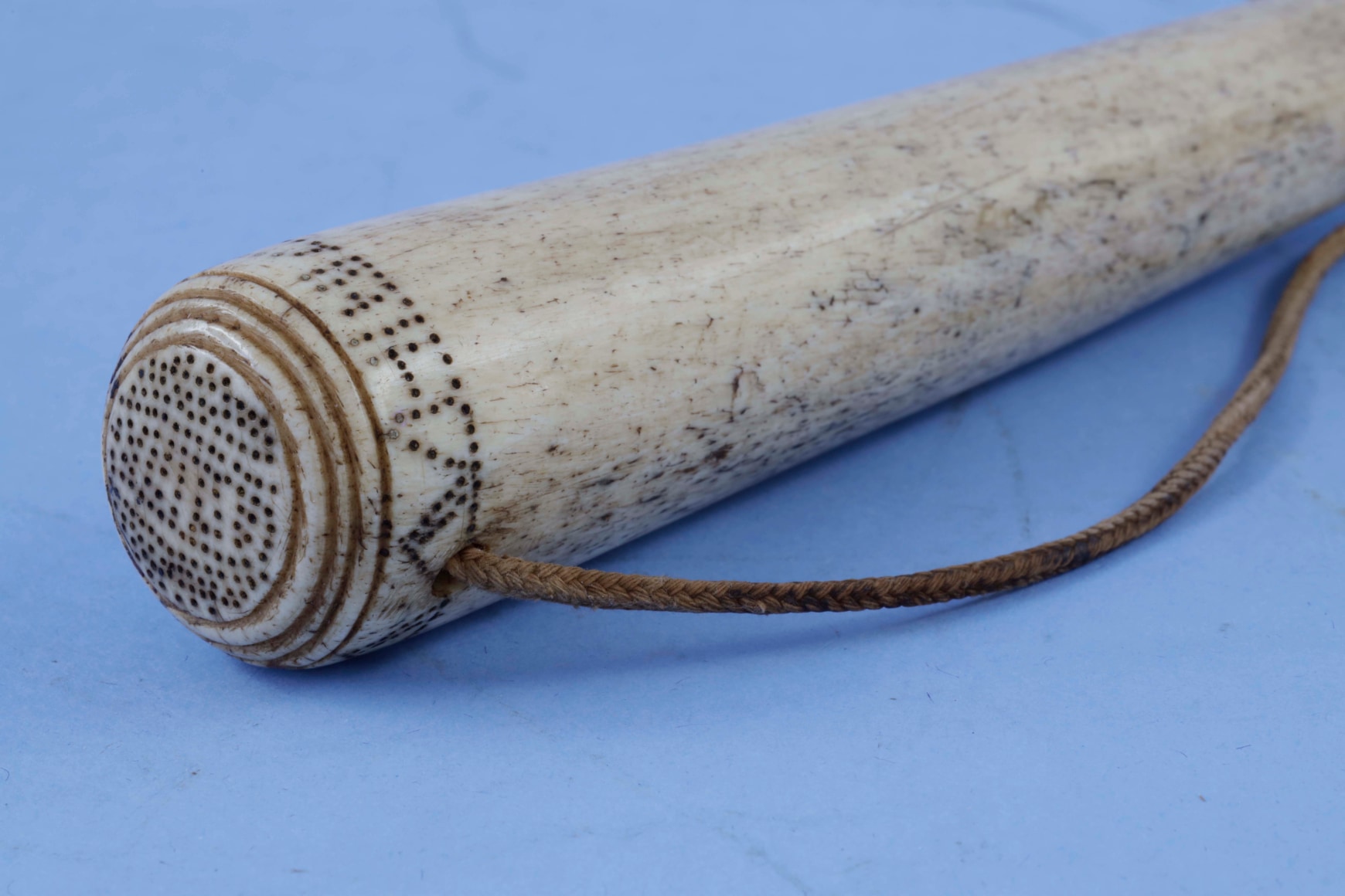 Whalebone fid with a tapered whalebone shaft. The butt end is rounded and has an attractive pique design around the top and a band around the top side. There is an old rope tether that is attached to the top of the fid with an adjustable whalebone keeper. (SC1192)