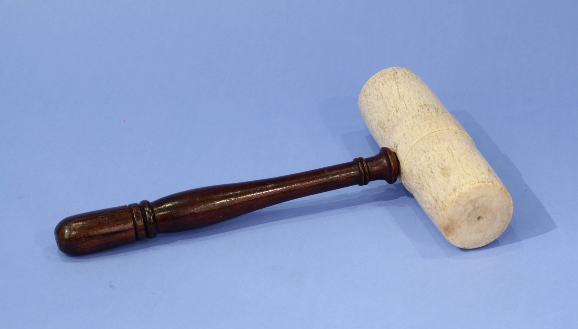 Whalebone and wood mallet, American, circa 1850. The head of the mallet is made from a solid block of whalebone turned into a cylinder with a raised band 1 1/2 inches in width. The center of the raised band is scribed as is the edge of one of the ends. The wood handle has a very sophisticated turning. (SC-990)