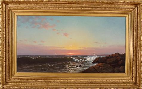 InformationOil on canvas, titled 'Sunrise With Rocky Shore', signed and dated lower right 'F. A. Silva 1875.' This painting is an outstanding example of Silva's luminous work. The right hand side of the picture has large rocks in the foreground. The rocks have a subtle glow resulting from the light of the setting sun. In the distance, one see a lighthouse and keeper's house and other structure. The sky has magnificent color and light treatment. The water is executed with great skill. In the foreground, there is a large wave which is breaking on the right hand side and cresting as it goes to the left. There are two small sailboats in the distance which add human interest as well as surfaces to reflect color. (PA-214)