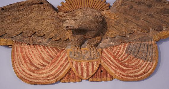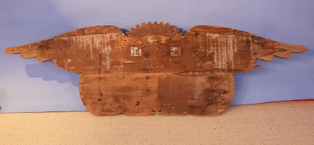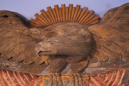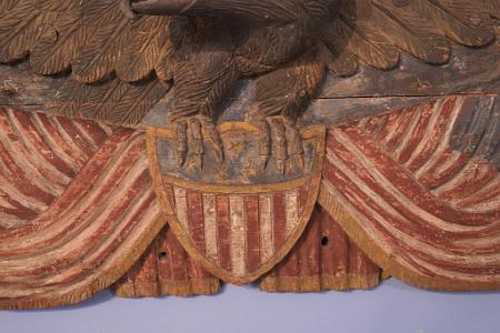 InformationImportant 19th century carved and painted American patriotic Civil War period stern board carving, circa 1860. The stern board is made from 5 pieces of pine laminated together. At the top of the wings the wood is about six inches thick and tapers as it goes down the wings. At the top center is a curved piece of pine carved and painted yellow-gold in the form of a sub-burst. Flanking the sunburst are two narrow pieces of pine which form the top of the wings which are applied to a full length and wide piece of pine which spans the wings tip to tip. The bottom section of pine is quite wide and has the carved polychrome red, white and blue polychrome draped American flags with shield in the middle. On opposite ends of the flag pole are spade like carved flag pole finials and centered on the polychrome shield are pair of the eagle’s talons. The eagles head is turned facing right with a well developed brow and beak. The tongue is articulated and is painted red.