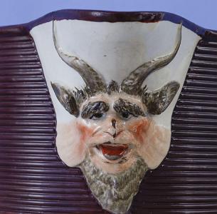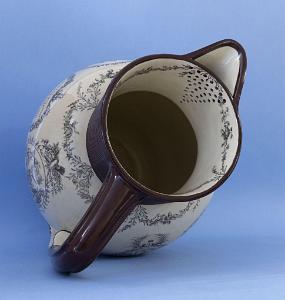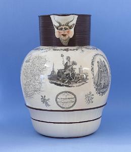 Tall ribbed neck with face of a horned satyr as the spout. Decorated with various transfers including a map of Ireland," May Irish Societies Freedom Maintain ...", "Union to the People of Ireland", "Tun'd to Freedom for our Countrywit", May I be freighted with Irish Manufacture ...", "Great Britain And Ireland United MDCCC" and "May all virtuous Irishmen Live in peace and dye happy". Enameled handle. Impressed Herculaneum mark. This is the largest Liverpool jug we have seen with the larest number of trasfer printed images. (MI-854)