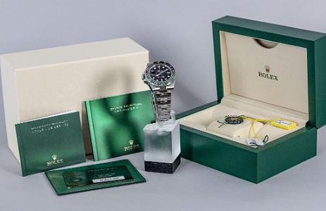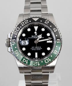 This model features a black dial and a two-colour Cerachrom bezel insert in green and black ceramic. Designed to show the time in two different time zones simultaneously during intercontinental flights, the GMT-Master II has come to be recognized for its robustness and versatile appearance.