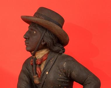 InformationHistorically significant ship's figurehead from the slave ship Piratenim which was captured by H.M.S. Sharpshooter on July 22, 1851. The figurehead is a wonderful example of the ship carver's art. Both the detail of the carving and the design and composition of the form is outstanding as is the paint and gilding. The figure is modelled as a South American gaucho or Bolero (mounted half-bred Indian Huntsman of the Argentine Republic), who catch the wild cattle and horses of the Pampas by hurling a ball, attached to a long line, round the animal's horns or forelegs, whereon the huntsman's horse, to whose saddle the other end of the line is secured, stops dead short, and so throws the pursued animal to the ground. The three-quarter length figure wears a curled brim hat, fastened to his chin with a string, with 'Piratenim' to the front, a white shirt and red scarf, a brass buttoned jacket and clasping his boleadoras to his left. There is a carved gilded star-like decoration at the bottom front of the figure and a carved scroll on the right and left front corners. The figurehead has a carved-out dove-tail shaped track along the bottom center of the base where it slid into position on the base of the bow. Centered in the back of the figurehead is a round hole that extends into the interior of the figurehead approximately 7 inches where an iron rod once fixed the figurehead to the vessel. Having the ship's name painted in gold at the front of the black hat ribbon is a feature of great rarity. Few figureheads are from known vessels because they are rarely identified as this one is with a painted name. The history of the figurehead and the actions taken by H.M.S. Sharpshooter to capture the slave ship Piratenim is told in a book titled 'H.M.S. Sharpshooter' and was written and privately printed by her captain, John C. Bailey. 'These reminiscences are printed for private circulation only amongst my relatives and friends. - J.C. B.' Accompanying the figurehead is a copy of the book which bears the inscription in the front: 'Lady Mary Ann Bailey from John C. Bailey.' This was the special copy that Captain Bailey gave to his wife.