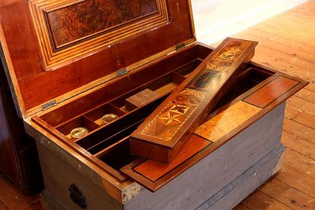 Brass Bound Lift -Top Tool Chest with Marquetry-Inlaid Lid and Movable Inlaid Compartments