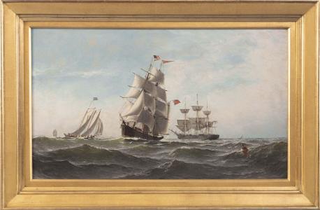 Oil on canvas depicting the ship "Albania" with pilot boat 11 off New York Harbor. The painting is a rare subject featuring three primary vessels, circa 1878. The “Albania is flying an American flag from her fore mast and a red pennant with the vessel's name from her main mast and an English flag from her gaff. To her left is a pilot schooner with the somewhat obscure number “11” on her main sail. She is flying the Union Jack from her main mast. To the right is a naval vessel at anchor flying an American flag. In the right foreground is a red buoy. The water is beautifully painted and is similar to the type of water Jacobsen painted in the late 1870's. The sky is a bright robin’s egg blue with scattered white clouds. This is one of the more artistic paintings we have examined by Jacobsen with the boats sailing in different angles and directions rather than a typical profile. (PA1026)