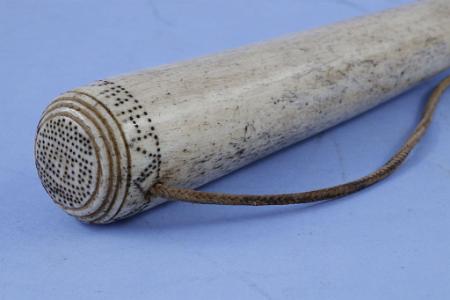 InformationWhalebone fid with a tapered whalebone shaft. The butt end is rounded and has an attractive pique design around the top and a band around the top side. There is an old rope tether that is attached to the top of the fid with an adjustable whalebone keeper. (SC1192)