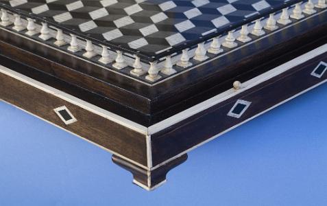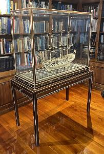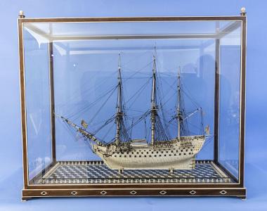 InformationExceptional detailed and large and important Prisoner of War Model of the British 100 Gun 1st Rate Ship  “Royal Sovereign” English/French circa 1790-1810. The core of the hull is wood and planked and pinned in bone from the keel to the topsides. At the bow is a carved figurehead in the form of a Roman warrior, hands at his sides and with a feathered headdress. The figurehead is supported by head rails with carved detail. The quarter galleries and transom are elaborately carved and pierced in bone with banded and rope-twist detail, the windows glazed in mica. The taff-rail, at the top of the transom, is cut and notched with a boom crutch and decorated with the heads of cherubs. Extending from the stern rails is a pair of davits rigged with hoisting lines and hooks. At the top of the transom, carved in relief, is an eagle, lion and dragon above double balconies with carved posts and railings. The lower portion of the transom is carved in relief and is fitted with a rudder with a decorated edge and check chains. The deck is planked and pinned in bone, and detailed with pin and fife rails, anchors hung out on posts, deck rings, cleats, capstan, belfry with turned bone posts and brass bell. The deck is cut out at the waist with carved railings and posts, and decorated with carved swags. On either side of the waist are a pair of boats swung out on hoisting lines. Other details include deck opening, ladders, poop deck with deck house, etc. Rigged with a bowsprit and three masts, each rigged with tops, trees, cross spars and stun' sail booms, all in bone, the standing and running rigging including ratlines running up from bone chain plates and rigged with bone deadeyes, turning blocks and fairleads. Other parts of standing rigging include stays, shrouds, intermediate shrouds, and running backstays. Running rigging includes sheets, halyards, topping lifts, bracing lines, and other rigged details. The Royal Sovereign was launched by the British Navy on September 11, 1786. (SM699) Provenance: James A. Farrell (America, 1863-1943), was president of U.S. Steel. At the time of the publication of the India House book, the model was on loan to India House by James Farrell and he eventually gave it to the Club and the model became the property of India House. The India House was founded in 1921 and was located at One Hanover Place in the financial district of New York. James Farrell was a leader in founding the India House and collection and wrote the Foreword to the India House book. The India House Foundation was formed in 1999 to save the collection but were unsuccessful and the collections were sold off. The model has a custom built marquetry base with classic geometric design made from multiple hardwoods and trimmed with holly. The perimeter of the base has an elaborate balustrade fence around the perimeter. The base slides in the case through a door and has attractive finial and feet. The base of the case is trimmed to match the model base. A handsome walnut table base sits below the case and has similar inlaid patters. Literature: Carl C. Cutler's A Descriptive Catalogue of the Marine Collection at India House (At the Sign of the Gosden Head, New York: 1935), p. 53, The model is described in item #159 on page 53. A photograph of model, titled “The Royal Sovereign” is illustrated full page on pg. 101. It is mentioned in the book description that this ship, the H.M.S. Royal Sovereign was Vice-Admiral Collingwood's flagship of the lee division at the battle of Trafalgar. Under Vice-Admiral Collingwood, the H.M.S. Royal Sovereign was the first ship of the fleet in action at Trafalgar on October 21, 1805. She led one column of warships; Nelson's Victory led the other. As she cut the enemy line alone and engaged the Spanish three-decker Santa Ana , Nelson pointed to her and said, "See how that noble fellow Collingwood carries his ship into action!". At approximately the same moment, Collingwood remarked to his captain, Edward Rotheram, "What would Nelson give to be here?". Upon Nelson's death, Vice-Admiral Collingwood became the admiral in command of the fleet, and he proceeded to bring the British fleet together in the final victory. Provenance: James A. Farrell (America, 1863-1943), was president of U.S. Steel. At the time of the publication of the India House book, the model was on loan to India House by James Farrell and he eventually gave it to the Club and the model became the property of India House. The India House was founded in 1921 and was located at One Hanover Place in the financial district of New York. James Farrell was a leader in founding the India House and collection and wrote the Foreword to the India House book. The India House Foundation was formed in 1999 to save the collection but were unsuccessful and the collections were sold off. The model has a custom built marquetry base with classic geometric design made from multiple hardwoods and trimmed with holly. The perimeter of the base has an elaborate balustrade fence around the perimeter. The base slides in the case through a door and has attractive finial and feet. The base of the case is trimmed to match the model base. A handsome walnut table base sits below the case and has similar inlaid patters.  A photograph of model, titled “The Royal Sovereign” is illustrated full page on pg. 101.  Description of Case: Walnut and holly custom case and table base for POW Model of HMS Royal Sovereign.  The Case has a walnut and holly trimmed base sides and top. The case has a hinged door which can be opened by first removing the holy pin at the stern side at the top right of the case. At the bottom of the door is a narrow panel with 2 small holy balls which act as grips to remove the panel which then allows the door to swing open.  On the model base there are two additional round pulls which can be used to pull or slide the model and base from the case. There are diamond shaped holy decorative inlays around the b