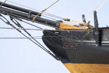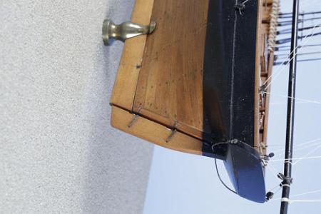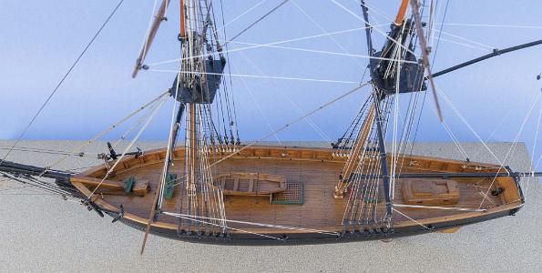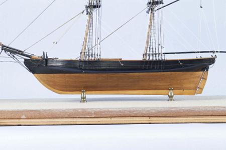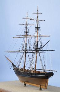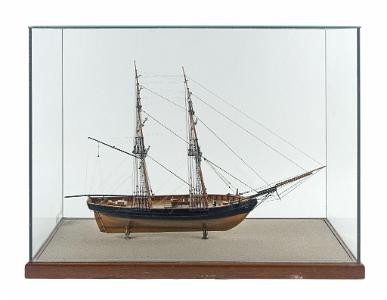 Hull built up from the solid hull and planked and pinned with a bright finished bottom and painted black topsides and rudder. The deck is also planked and pinned in the same manor as the hull. The cap rail finished bright as are the planked decks. Detailed with bowsprit bracing posts, anchors, pin and fife rails, companionway, ship's boat on cradles, deck gratings, pump, deck house, tiller, etc. Rigged as a brig with a bowsprit, two masts, stun'sail booms, standing and running rigging, hoisting lines and more. Displayed within a glazed case on a pair of turned brass pedestals on the traditional Boucher gray sand base. The model retains it's glass case which has beveled glass on the top.. The bottom of the glass has wood trim that that screws into the case wood base from the underside. (SM701)