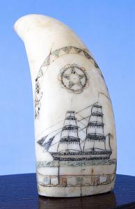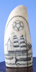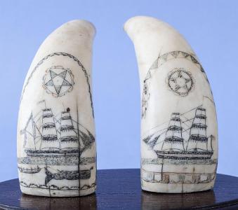 One tooth depicts a whaling scene with an an American-flagged whaleship, a whaleboat and a harpooned whale, contained within a rope-like scalloped arch. Other tooth depicts a brig with a red boot stripe flying an America flag off the stern and a long pennant off the mainmast, contained within a red, green and black geometric arch. On both teeth, above the ships, are red and green floriform medallions containing five-pointed stars with shaded blades and a small dot in the open pentagonal centers. (SC1210)