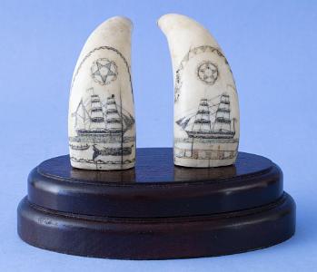 Pair of Polychrome Whales Teeth with Ships and Whaling Scene