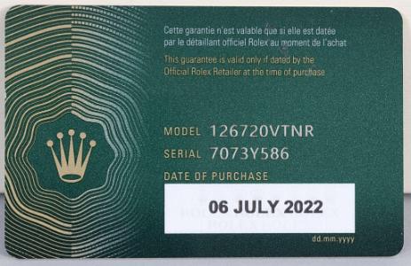 InformationStainless Steel Rolex GMT Master II (40mm dial) with stainless steel oyster bracelet. The model number is 126720VTNR and the serial number which appears on the bezel and card is #7073Y586 and the watch was issued on July 2, 2022 2022.