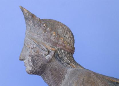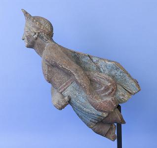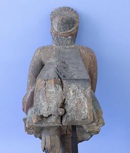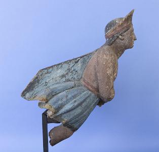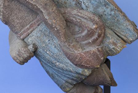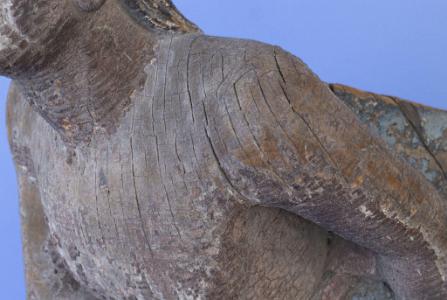 Condition: The figurehead is in untouched original condition. The paint color has a wonderful mellow glow and has a crackled surface. There is a concentration of paint loss in the front of the face, chest and right arm. The carving has typical age cracking and the bottom of the legs have been missing for some time. (FA-1131)
