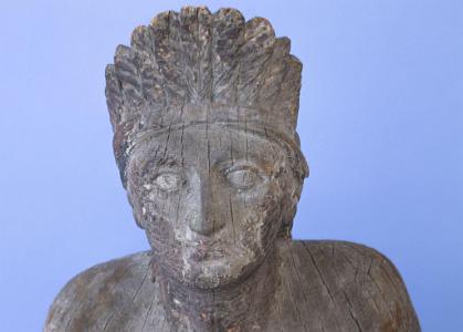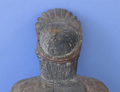 InformationExtremely rare and important carving of an American Indian Princess, attributed to Joseph Bowers of New York, circa 1850. She is made out of a single block of wood. This beautifully carved figurehead has a original painted surface. Her skin tones are a rust red color and her skirt color is a bright blue. The Indian princess is wearing a headdress. The carved feathers are in a standing vertical position and are highest at the center and gently taper in height as they go around the head. The headdress retains some black paint in the feathers and some red in the thin band running around the perimeter of the base of the headdress. Below the headdress are carved hair strands which are parted at the center of the forehead and continue over the ears and then down the back in black paint. Her facial features are very refined and delicate and she has peaceful countenance. The eyes are very detailed and there is some of the original pigment that features the pupils in her eyes. The Indian's right arm crosses her waist at an angle and her right hand is clutching a rounded object. The Indian's left arm is along her side and her hand is covered by a flowing red sash which is attached to an articulated belt or sash. The skirt has beautifully carved folds and a mustard painted border along its base. Below her heaid is a slanted section of natural wood which has a lot of color resulting from exposure to the elements while in service on her vessel. This section was unpainted because it would have been covered by the bowsprit or some spar on the ship that was mounted above covering this unpainted area. The original iron rod that mounted the figurehead to the vessel is still present at the back of the figure and one can see where the hole is in the lower section in the front of the figure. The carving has a great size for display purposes and having an Indian princess as the subject of the carving, makes this ship’s carving highly desirable piece of American Folk Art.
