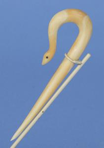 InformationCarved whale ivory graceful and elegant bodkin in the form of a looped serpent, American mid 19th century. At the top of the curve the serpent body loops around and tapers in width. At the end of the loop the serpent’s neck is thin and then the head broadens a bit with inlaid tiny eyes and then tapers to a point. (SC1248)