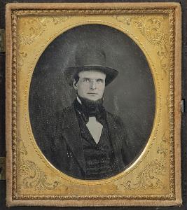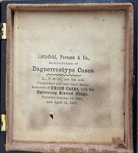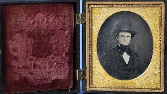 InformationSixth Plate Daguerreotype of a young handsome gentleman who is probably a fireman Seated with Tall Hat. Has has a beard with no mustache. He is wearing a black jacket and vest with a wide bow tie. His cheeks are slightly colored rose and the image is very crisp. The case has its original fancy engraved oval mat and patterned red velvet on the opposite side. The dag has its original gutta-percha case with a raised standing portrait fireman holding a speaking trumpet, circa 1855. When the dag is removed from the case the original makers paper label is visable and states "Littlefield, Parsons & Co. Patented October 19, 1856". (PH-459) Note: The dag was included in an old and large collection of 19th century fire memorabilia and apparatus belonging to the fire specialty auctioneer Chuck Deluca that ran fire auctions in York Maine in the 1980s. Case Size: Height 3 7/8, Wide 3 1/4, Inches