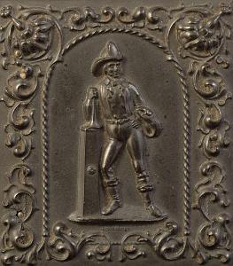 Sixth Plate Daguerreotype of a Fireman Seated with Tall Hat. The dag has its original gutta-percha case with raised image of a standing fireman.