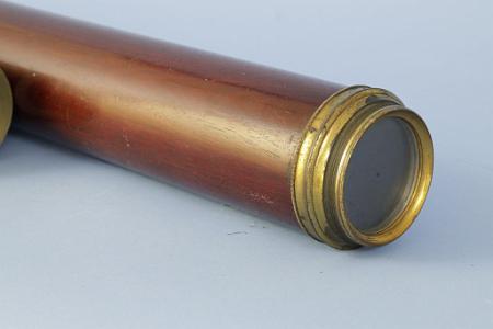 InformationA very large two-part, 3” tapered single draw telescope with mahogany barrel signed on the draw tube J. Gilbert, Ludgate Street, London circa 1778. The telescope has a typical bulbus eye piece retaining the original dark slide. The draw tube has the eyepiece at one end and there are five other lens elements in the tube. The draw tube screws apart at the point where each of the lenses is set so they can be cleaned. At the center is a 2-part heavy brass threaded fitting allowing the telescope to tread apart into 2 more manageable sized parts. The objective lens is held within a round brass fitting at the end of the scope and has no lens cap. The telescope measures 3 inches in diameter at the front lens end and 3 inches at the eyepiece end.