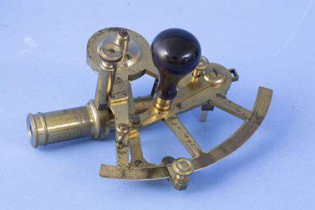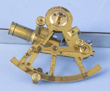 InformationEXTREMELY RARE MINIATURE BRASS SEXTANT BY FAMED MAKER JESSE RAMSDEN. Circa 1785. Fully signed on t-bar, in beautiful script engraving, "Ramsden London". Reverse with serial number "866". 4" long index arm with top mounted tangent screw and a beveled scale divided 0-30 degrees. Index mirror. 4" radius with a beveled scale that's divided 0-130 degrees. Horizon mirror with an adjusting arm. Removable telescope mount, swing away magnifier, 2 telescopes and a ebony handle that all store neatly in the shaped mahogany storage case when not in use. Overall condition superb with the majority of the brass retaining its original lacquer finish. The meticulously fashioned case was made using beautifully grained mahogany. Jesse Ramsden is considered to be the premier instrument maker of his time. He was awarded substantial prizes for the innovation of his improved dividing machine. His instruments were carried by Captain Cook. The workmanship on this little gem of an instrument is remarkable throughout. (I-0980)