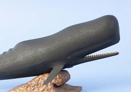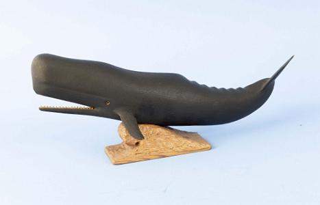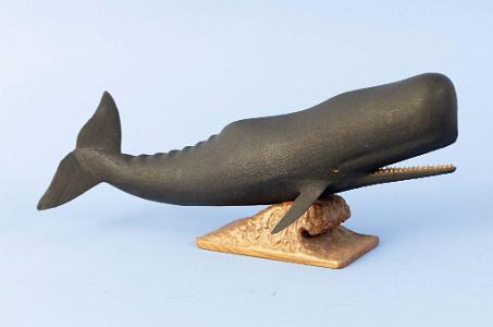 InformationCarved and black painted Sperm whale signed on the bottom “SPERM WHALE, 1968, by INNIS”. The whale is carved anatomically in excellent form. His open jaw shows about 40 inserted sharp metal teeth with its carved eye just rear of the mouth. Attached to the whale’s body a little back from the eye and below are a pair of pectoral fins which protrude from the body. The carving shows the whales ringed back and large fluke which is turned to the side as though he is motion. There is an impression at the top front of the whale’s head indicating the “blow hole”. The whale is mounted on a carved natural wood base, that simulates a breaking wave.