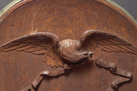 InformationExemplary pair of mahogany carved gangway boards that were probably used on board a vessel of the United States Navy attributed to the master carver, John Hale Bellamy. Gangway boards were large decorative plaques that lined the opposite sides of the ship’s gangway (the walkway providing passage to the ship) located around the middle of the hull. Each of the matching gangway boards has the typical shape with an arched top, lined with brass with applied brass “rope rings” on opposite sides. Each carving is rounded on one bottom corner and straight on the other. One gangway board has a deep raised carved eagle perched on an American shield flanked by two carved American flags, above draped curtains at the bottom. The other has a deep relief carved spread winged eagle with carved wavy ribbons flowing from each talon and a large carved Indian warrior below standing on rocks holding a tomahawk. All the uncarved flat surfaces of the gangway boards have a stipple even surface throughout. This is a method Bellamy used on the the pairs of gangway boards he made for the USS Enterprise and other carvings with flat surfaces. The eagle and shield gangway boards has many distinctive features.