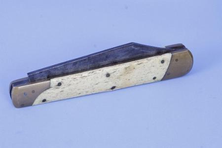InformationLarge Whale bone Grip Folding Sailors Knife, American Last Quarter 19th Century, last Quarter 19th Century. This heavy-duty folding knife has a steel frame with brass bolsters. the front bolster is thick brass has has a decorative curve and is fastened with 2 brass pins.The rear bolster has a straight angle in the front and is fastened with 3 brass pins. The whale bone grips are rounded and are fastened with 3 pairs of brass pins. The blade has a clip point shape with a thumb nail recessed grove for opening. (KN0049)