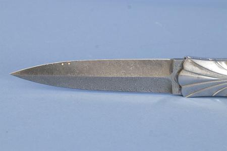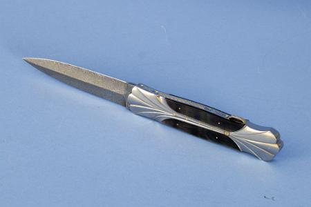 InformationFine custom knife signed KA Steigerwalt in the inside base of the the case. The case has fan relief shaped bolsters with black lip pearl grips. The grips are help in place by small gold pins. The polished steel bolsters has a thin tapered section that runs from the bottom of the front bolster to the top of the bottom one. This tapered section has four inlaid decorative gold dots that are in graduated sizes. Below the dots is a larger gold pin with a rosette like engraving. The dagger shaped blade is made from demascus steel. The blade locks into position and the lock release is on the top back section of the bottom edge of the grip. The bottom of the case has a long rectangular gold inlay with a rope like surface with a smaller steel engraved pattern on opposite side of the gold bar. (PA0053)