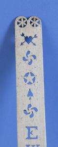 InformationFine pierced whalebone busk with pieced decoration. The top of the busk has the shape of the top of a heart with pierced pinwheels at the top corners, American, circa 1870. There are several other pierced decorations including stars, hearts, a spade, and a three-leaf clover. At the center are larger carved out initials with the letters “EWS”. At the bottom is another pair of pin wheels. (SC1284)