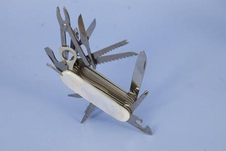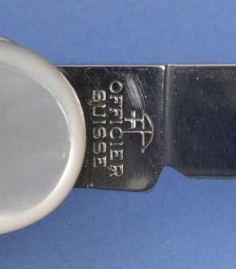 InformationMulti blade Swiss Army Knife signed Victorinox Switzerland, Stainless Rostferei on the main blade model . The knife has attractive and very rare mother-of-pearl scales. The top of the knife has 8 fold-out blades and the opposite side has 4 blades. The top side of the knife has a toothpick and tweezers that pull out from the bottom of the scales. The knife has a black leather case signed Victorinox with a Velcro folding tongue, a belt loop and a pocket for a small flashlight and a pull out clear plexi-glass 3-inch ruler with a thermometer, magnifying glass and compass. (KN0059)