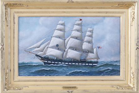 Information "Antonio Jacobsen (Danish-American, 1850-1921), Portrait on board, of the Black Ball Line ship 'Isaac Webb', signed lower right "Antonio Jacobsen" circa 1915. The ship is sailing under full sale and she is flying from the peak of the mainsail the Black Ball Line House flag or the owners the Black Ball Line. She is flying the American flag of the gaff near the stern. It was standard for the ship's of the Black Ball Line to have a large black ball painted on the the second sail up on the fore mast. The bow of the ship has a yellow painted billet head and trial board. Just back from the bow is a quarter board bearing the vessel's name "Isaac Webb". The painting has a bright blue sky with puffy whit clouds and greenish blue water. (PA1073) Condition: Excellent Dimensions of Painting Sight : Height 12, Width 20, Inches Dimensions of Frame: Height 15, Width 23, Inches Provenance: Laura and William Buck Family Collection, Philadelphia Note: The 'Isaac Webb' was built by William H. Webb (1816-1899), a noted New York designer and shipbuilder. In 1851 Webb designed and built the ship Isaac Webb for the Black Ball Line. The vessel was in service until 1880. Founded by a group of New York Quakers, the Black Ball Line built sturdy and fast packet ships to transport passengers and cargo across the Atlantic.