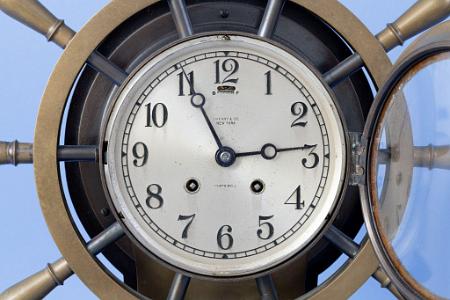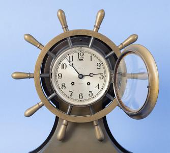InformationChelsea 6-inch Mariner Sip's Wheel clock, Boston, Circa 1970. The clock has an engraved silver dial with Arabic numerals. The dial is engraved: "Tiffany and Co. New York and "SHIP'S BELL". The clock has patinized bronzed brass case with a ten spoke ship wheel around it. The clock sits on a bronzed base. The back and bottom of the base are mahogany. The clock retains the original Chelsea eight-day time and strike movement which is numbered: "164736",