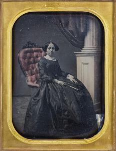 InformationUNKNOWN PHOTOGRAPHER Portrait of a Woman Seated, c. 1850 Full -plate daguerreotype, cased, with hand-tinting (PH0464) Provonance: The Maillet Daguerreotype Collection Condition: The plate is in excellent condition and the and the case has some minor lifting on the spine. Dimensions: Case Closed Height 9 Inches, width 7 Inches, Case Open Height 9 Inches Width 14 Inches, Height 9 Inches