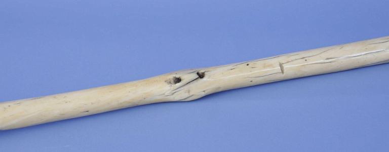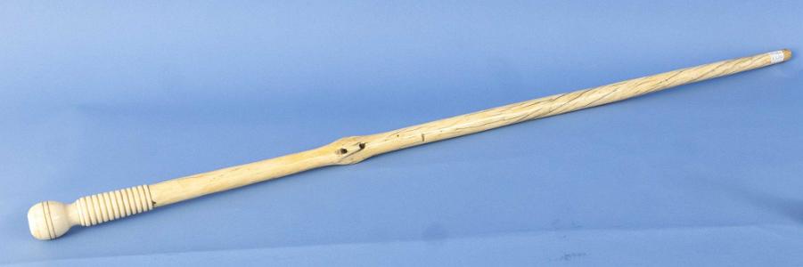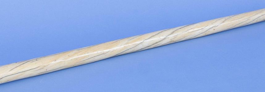 InformationRare and unusual whale ivory and narwhal cane, mid-19th Century. The ball-shaped grip is made of ivory with two scribe lines at the center followed by a series of eleven raised bands. The shaft is a 33 ¼ inch single piece section of tapered narwhal ivory. One third down the shaft are two holes which once held a leather wrist strap. (WS0266)