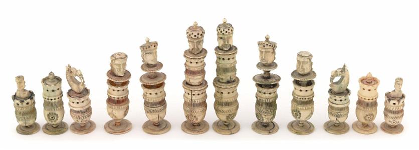 InformationPrisoner-of-war carved bone chess set, French/English, circa 1810. This is a complete set of 32 chessmen, 16 stained red and 16 stained green. Each piece, save the knights and rooks, have figural heads or busts atop footed bases carved with crosshatch and circle designs. The detail of the heads and faces of each piece is excellent. All of the pieces sit on turned bone bases and have carved and pierced fine details. Knights and rooks have matched footed bases and the appropriate stylized horse head and castle turret. (SC 1320) Condition: The set is generally in good condition especially for something older than 200 years. Except for the knights all the pieces have small ball finals above the head and several are lacking. There are scattered losses to some of the edges of the various pieces.