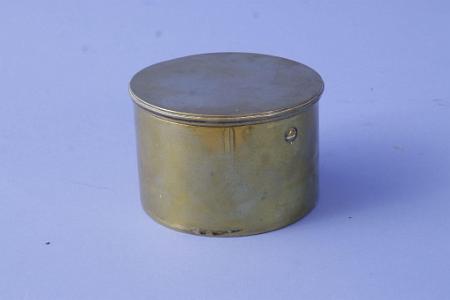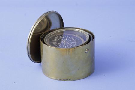 InformationRare miniature 2 1/2" brass Compass, signed Dollond in brass case, English, circa 1820. The compass has a paper card signed at the center "Dollond London". The compass bowl is all brass and is set into a gimbal ring which is mounted on to a round brass box with brass lid. (I 1004)