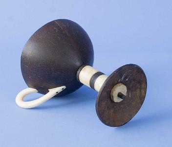InformationRare and unusual coconut shell and whale ivory chalice, American, circa mid-19th century. The bowl of the chalice is made from half a coconut shell. It has a gracefully applied whale ivory handle. The base is also made from the top of a coconut shell and is connected to to the top with a round post made from alternating sections of ebony and whale ivory. The is a threaded rod that runs from the bowl to the bottom of the base and is held together on each end with whalebone nuts. (SC 1325)