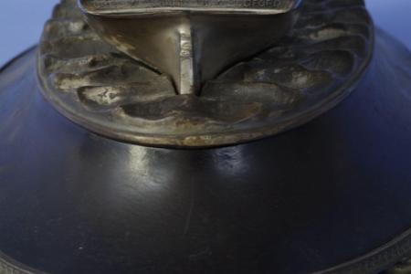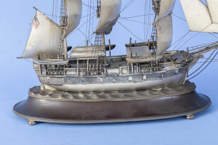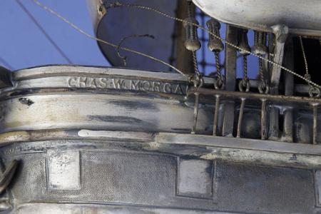 InformationRare silver plated rigged model of the Whale Ship "Charles W. Morgan" by Pairpoint Manufacturing, New Bedford, MA, circa 1910. The model is fully rig with silver sails. Stamped on the bottom of the hull near the center of the skeg is "PAIRPOINT". The model is made in three sections: the ship, the water and a wooden base with silver plated feet. The vessel is carrying several whaleboats and is a fine miniature of the real ship. (SM-0733)