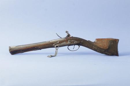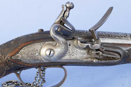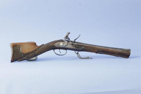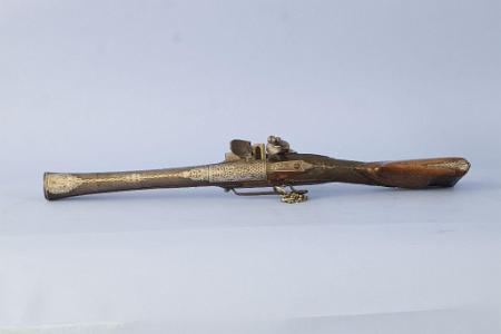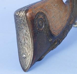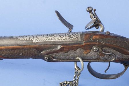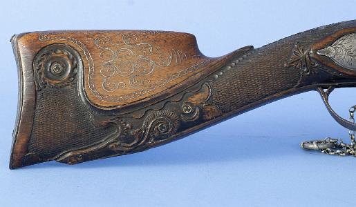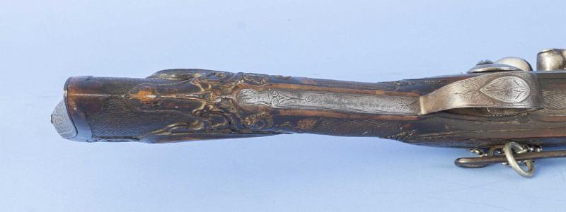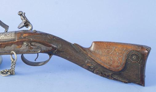 InformationSmall ornate 18th century European flintlock blunderbuss, manufactured for the Eastern trade. The barrel exhibits an extensive scroll design with silver accents. The stock has elaborate carving throughout. There is a detailed silver wire inlay on the flintlock side of the shoulder stock where it is smooth. Both side plates, the hammer and lock, and trigger guard are handsomely engraved. The piece has a full length stock with ramrod. (I 1009)