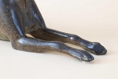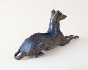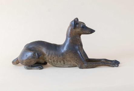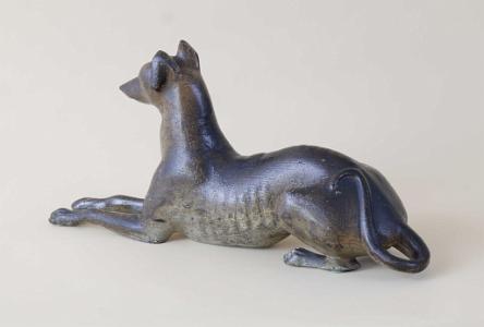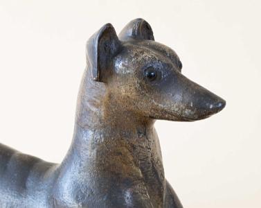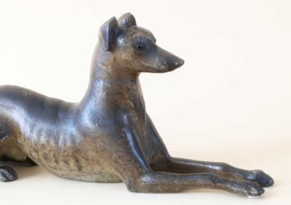 InformationExceptional and rare cast iron doorstop featuring a reclining whippet dog with head up and front legs extended with paw details on the feet. The dog is presented with amazing anatomical accuracy. The head is thin and long with pronounced aye brows and set in glass eyes. The ears are mounted to the back of the head and are in an upright position. Below the neck is the chest and ribcage with exposed ribs along the bottom. The dog’s waist is very narrow, and he is sitting on his haunches. The dog’s long tail spins around with an open loop and continues up the dog’s back and ends on top his left haunch. The dog’s rear legs and feet are shown in a seated position, and the rear paws have articulated claws. The Doorstop retains a light and dark mottled surface. The color and tones are lighter under the dog’s ribs and belly. (FA1198)