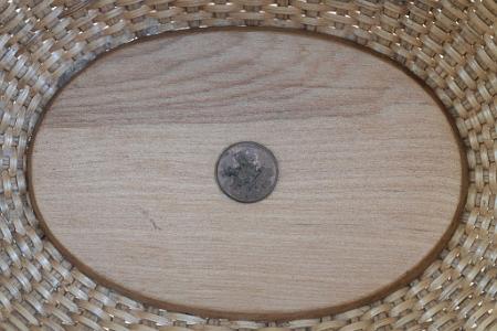 InformationVintage Nantucket Purse the signature carved on to the bottom of the maple base states “MADE BY MICHAEL KANE 1973, NANTUCKET ISLAND”. There is a small label stating “Ron Hoffman and Tony Giampetro Collection”. Set into the top of the bottom base is a 1973 penny. On the bottom is a small label which states “Hoffman and Giampietro Collection”. The basket has a walnut oval plaque mounted to the top of the lid are three carved whalebone species of whales and a dolphin. The basket has oak rims on the top and basket base. The basket has oak ribs and rattan weave. The swing oak handle has a nicely curved edge at the corners and attaches on both sides to the lower oak rim. The handle attaches to the basket with bone knobs turned and washers with brass hardware. At the front of the basket is a wrapped leather top loop which fits into a second wrapped loop which is attached to the bottom rim. The lid locks by placing the small turned bone fid on a woven safety cord through the loops. Mounted to the top and bottom on the back of the basket is a pair of leather cane wrapped loops which act like a pair of rear hinges.Condition: The basket is in excellent condition and has a deep mellow patina. (FA1204)Dimensions: Width of rim 9 Inches, Width of ivory side knobs 10 1/2 Inches, Height to top of basket 8 Inches, Height from bottom to top of handle 11 3/4 Inches.