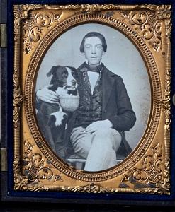 Sixth Plate daguerreotype depicting a Young Man With His Dog Holding a Nantucket Basket in his Mouth, American circa 1855