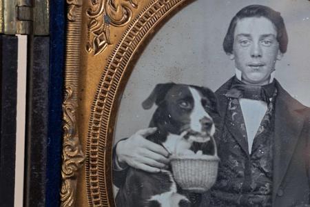 InformationDaguerreotype depicting a well-dressed young man seated next to a medium sized black and white dog holding a "Nantucket Basket" in his mouth, American circa 1858. The dag is very crisp and there is little or no doubt that the basket is one of the earliest examples of a Nantucket basket from the 1850's, the earliest beginnings of Nantucket baskets. The daguerreotype is noted on the back that it has a gentle cleaning on 7/15/11 by Casey Waters of Exeter N.H.. The Dag has a Thermo-plastic Union case with a label in the back which states “Littlefield Parsons & Co. Daguerreotype Cases, Patented October 14, 1856 and April 1857”. (PH0474) Note: This is likely the earliest photograph known depicting a Nantucket basket. By the late 1850s, most American artists had switched from the daguerreotype process to large glass-plate negatives and albumen silver prints that combined the exquisite clarity of the daguerreotype and the endless reproducibility of paper-print photography.