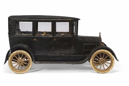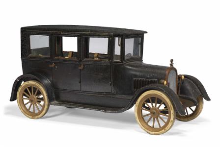 InformationThe professional quality model of the 1926 Chrysler G-7 series four door sedan is of outstanding quality. It was built to be a model to be exhibited at a Chrysler showroom in 1926. The car body fenders and running boards are painted black. The spooked rims are gold and the tires white. The grill and headlights are well defined as are the taillights. There are three windows on each side of the car that go up and down by pulling on a piece of beige fabric. The windshield has special hinges that allow it to open forward. All four side doors open and close by moving the door levers. The rear door lifts open and below the trunk is a rounded copper compartment that also opens. The car has a finished interior with seats and steering wheel. The interior is nicely finished, and the back section has a window that goes up and down to soundproof the passengers in the back from the driver which was a common limousine feature Also there are two facing rear seats that also is a limousine feature. If one turns the steering wheel both wheels turn. (MI0899)